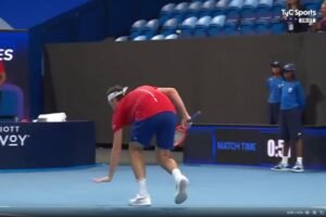 En el partido de singles masculino entre Argentina y Estados Unidos en la United Cup, Taylor Fritz (6º) festejó uno...