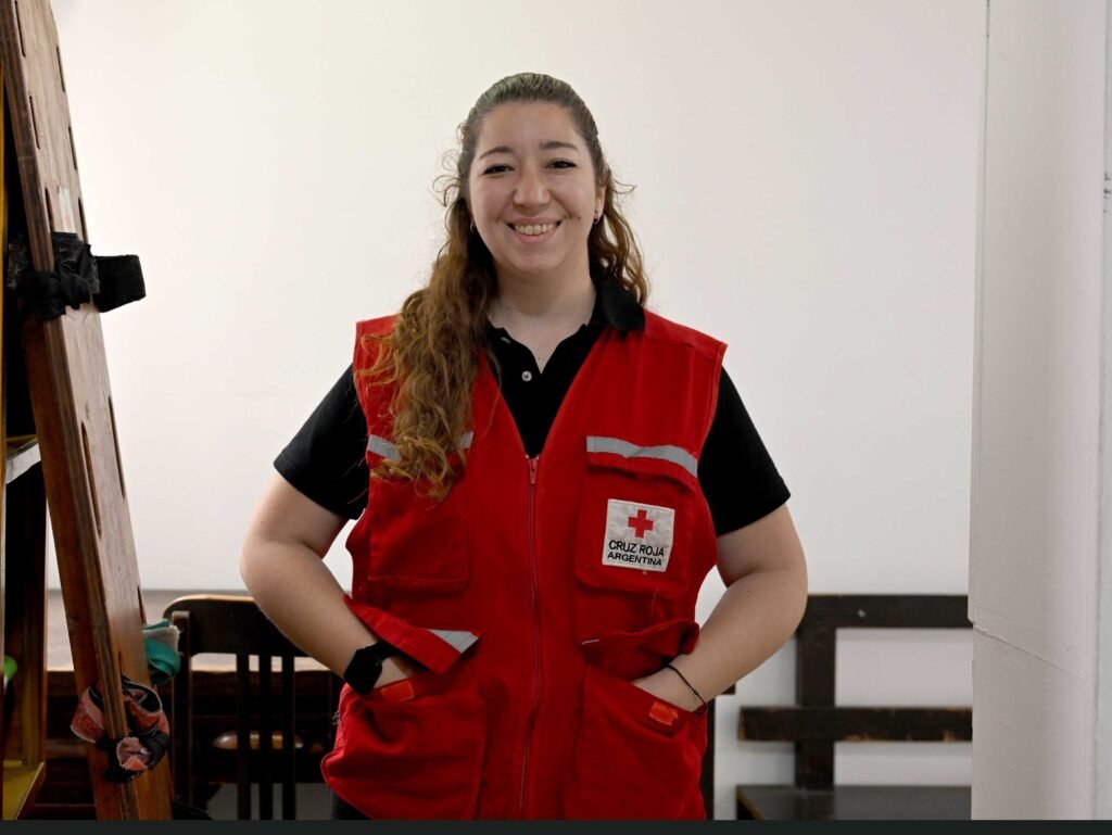 Tiene 33 años y es voluntaria de Cruz Roja Argentina desde 2012. Las cámaras de LN+ la registraron en vivo comprimiendo el pecho del vecino Fernando Klein cuando todavía estaba inconsciente (había sufrido un paro cardiorespiratorio) y era trasladado en la caja de una camioneta por las calles anegadas de la ciudad.