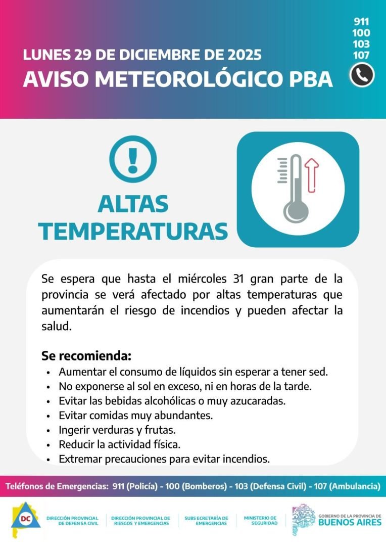 En tanto el Servicio Meteorológico Nacional informó que hasta el miércoles 31 se esperan en gran parte de la provincia altas temperaturas que aumentarán el riesgo de incendios y pueden afectar la salud.