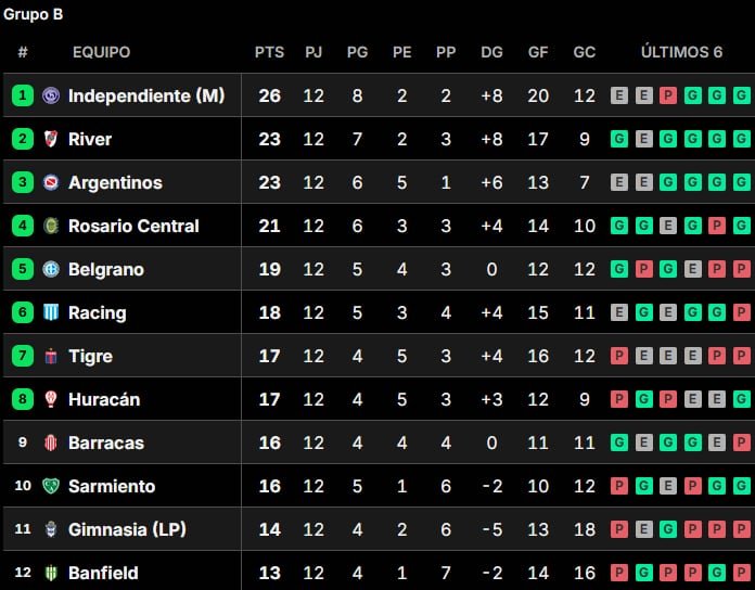 En el Grupo A el Fortín manda con 22 puntos a pesar de la derrota, la segunda en fila, que sufrió en Mendoza ante Gimnasia 3 a 2. Su escolta es Estudiantes de La Plata con 21 unidades, a pesar de que también cayó ante San Lorenzo 1 a 0 en el estadio Nuevo Gasómetro. El que aprovechó fue Boca y, con su triunfo en Córdoba sobre Talleres 1 a 0, escaló hasta el tercer puesto con 20 tantos, uno más que Unión de Santa Fe -venció a Deportivo Riestra 2 a 0-.