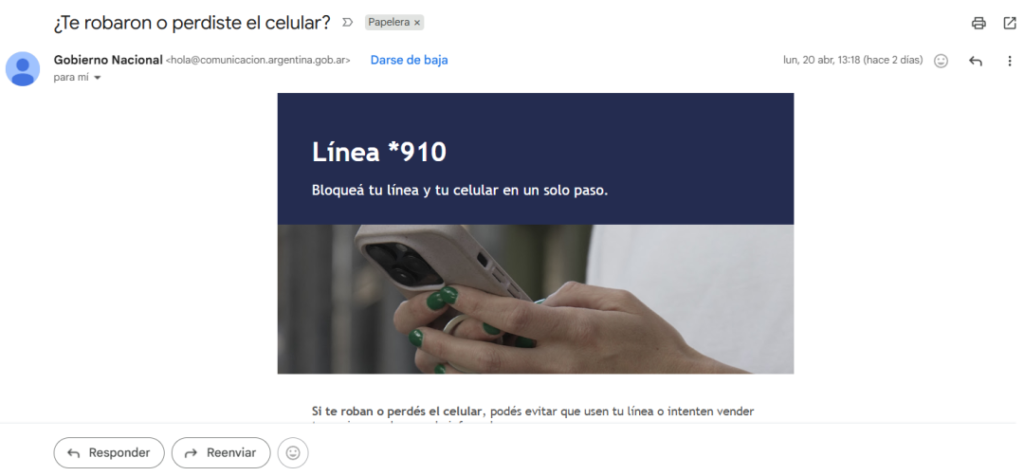 La Oficina Municipal de Información al Consumidor (OMIC) lanzó una advertencia a la comunidad ante la circulación de correos electrónicos fraudulentos que simulan ser oficiales y hacen referencia a una supuesta línea *910 destinada al bloqueo de celulares robados o perdidos. Desde el organismo indicaron que se trata de una maniobra de ciberdelito que apunta a engañar a los usuarios para obtener información sensible.